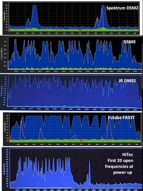 Futaba’s first 2.4 GHz RC radios started out with 10 kHz modulated FHSS and later models added DSSS which was introduced as FASST. Spektrum’s DSSS only system (no hopping) was introduced as DSM which was later enhanced with two hopping frequencies called DSM2, more recently followed with 23 hopping FHSS frequencies called DSMX.