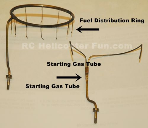 The starting gas tube just diverts to two pipes and they go down opposite side vapor tubes in the combustor (for starting only). I cleaned them the same way as the fuel ring and needles but they are larger in diameter and not as easily blocked, cleanliness is still important regardless.